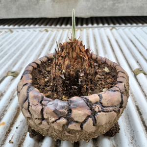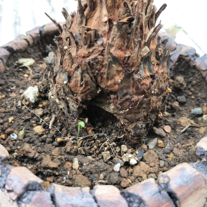 11 月末に植えたソテツ数本からやっと新芽がでてきた。