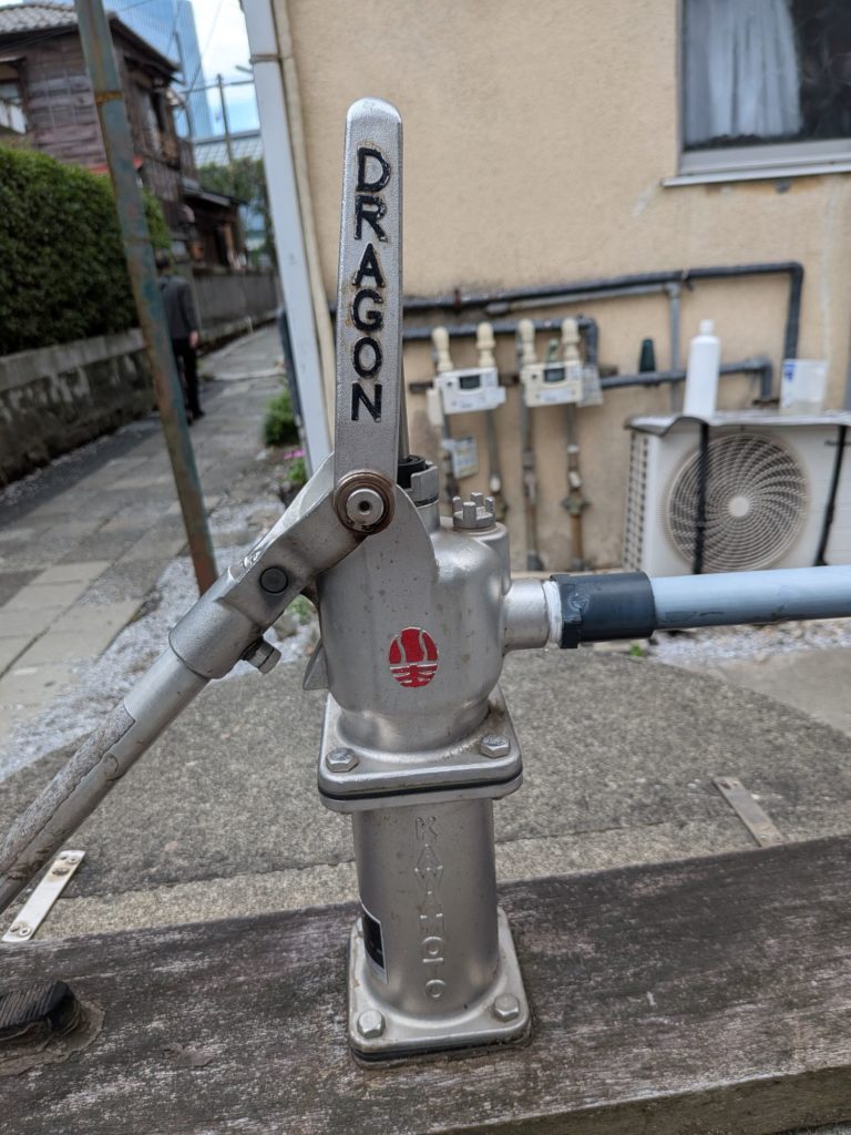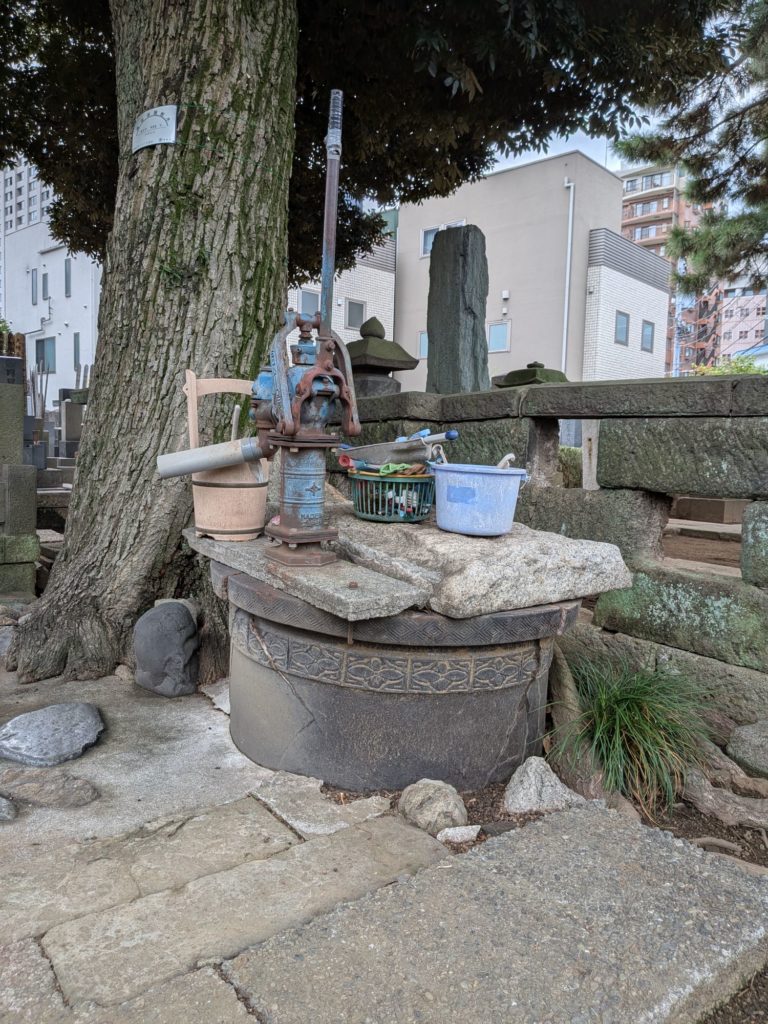 お墓や植物への水やりに懐かしいポンプが今も現役で使われている