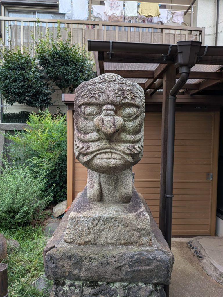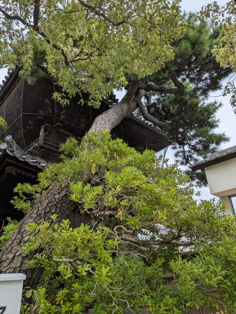 門の屋根瓦に枝が接しており倒木の注意のためかカラーコーンが気持ち程度に置いてある