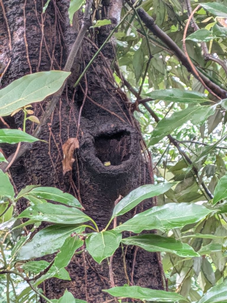 木のうろからはヘビかトカゲが外をうかがっている
