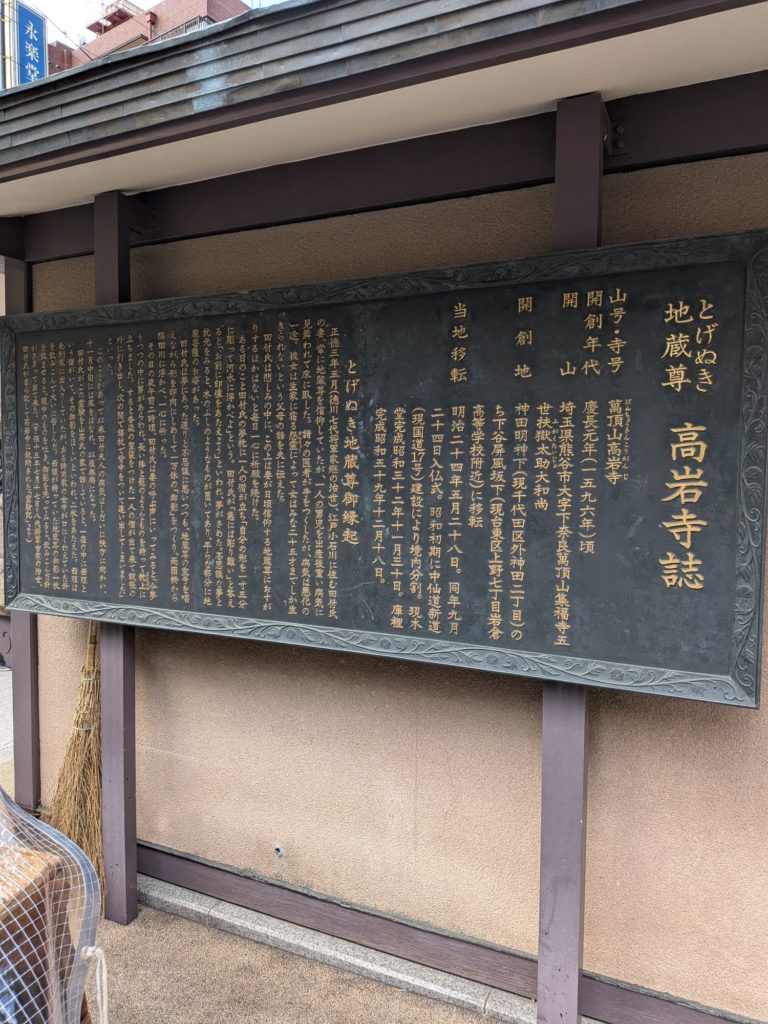 「とげぬき」の由来は江戸時代、毛利家の女中が誤って針を飲み、もがき苦しんでいるところに居あわせた僧侶が「地蔵菩薩の霊印」を写し取った紙札「御影」を飲ませたところ、針が紙札の地蔵尊を貫いて口からでてきたことによるそう