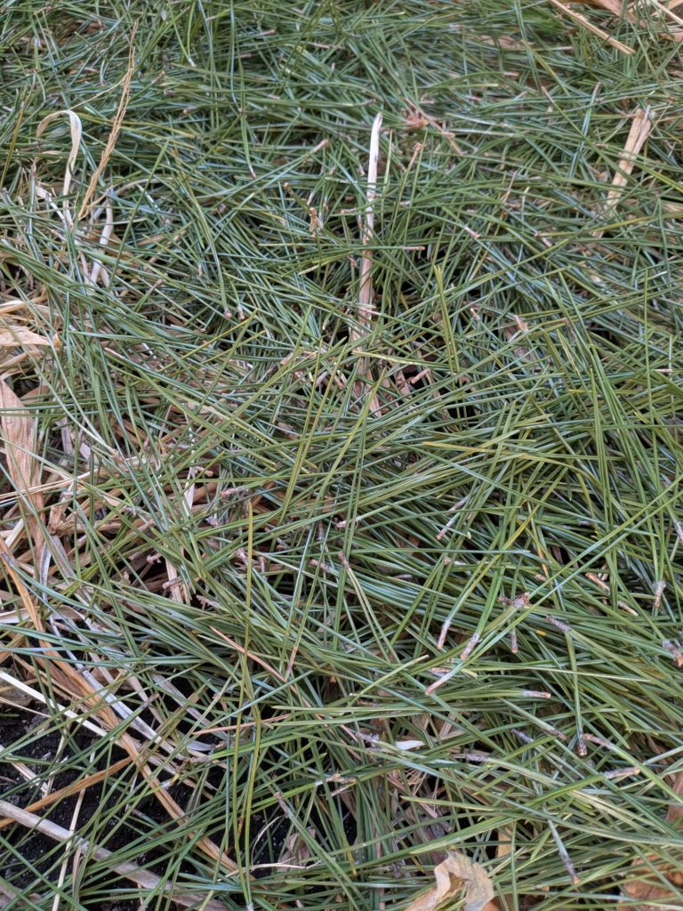砂の代わりに使った堆肥をミョウガ畑に撒くついでに葉の青い松を敷松葉にしてみた
